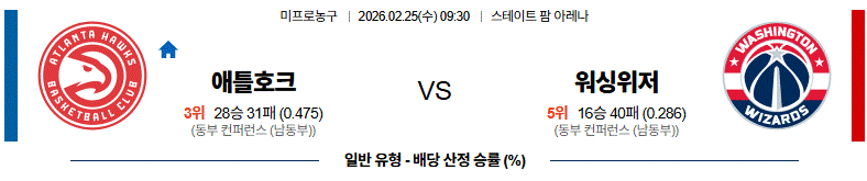 애틀랜타는 직전 경기에서 강한 리바운드 장악과 4쿼터 집중력을 앞세워 역전승을 거두며 분위기를 끌어올렸다. 제일런 존슨과 오콩구의 골밑 장악력과 맥컬럼의 외곽 지원이 안정적이며 최근 공격 전개 흐름도 개선된 모습이다. 홈에서는 기복이 있지만 속공과 트랜지션에서 경쟁력을 보여주고 있다, 반면, 워싱턴은 외곽 수비 불안과 후반 집중력 저하가 반복되고 있고 원정에서는 5승21패로 경쟁력이 크게 떨어진다. 리바운드 열세와 수비 조직력 문제도 부담이다. 애틀랜타 승리가 예상된다.
