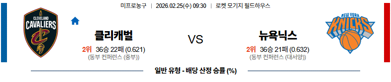 다음날 원정에서 밀워키를 만나는 일정을 위해서 힘을 분산해야 하는 클리블랜드는 직전 경기 패배로 연승이 중단됐지만 홈에서는 5연승 흐름을 유지하며 안정적인 경기력을 보여주고 있다. 미첼과 하든 중심의 공격 전개가 꾸준하고 홈에서 수비 집중력과 리바운드 경쟁력이 살아나는 모습이다. 턴오버 관리와 외곽 수비만 보완된다면 반등 가능성이 높다, 반면, 뉴욕은 최근 상승 흐름이지만 득점력은 떨어지는 추세에 있다. 클리블랜드 승리가 예상된다.