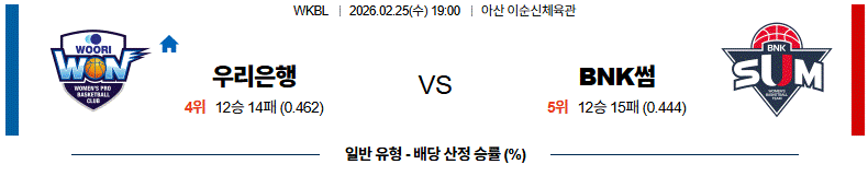 우리은행은 김단비 중심의 공격 의존도가 높아진 가운데 이명관 이탈 이후 리바운드 열세와 골밑 수비 약점이 뚜렷해진 모습이다. 최근 3연패 흐름 속에 공격 전개도 단조로워졌고 홈에서도 연패가 이어지며 분위기가 좋지 않다. 외곽 슛 성공률은 유지되고 있지만 제공권 싸움에서 밀리는 문제가 반복되고 있다, 반면, BNK썸은 연패 흐름이지만 박혜진과 김소니아, 이소희, 안혜지 중심의 공격 밸런스가 비교적 안정적이며 원정에서도 최근 흐름이 나쁘지 않다. 빠른 공격 전개와 가드진의 활동량이 강점이며 우리은행의 골밑 약점을 공략할 가능성이 높다. BNK 썸 승리가 예상된다.