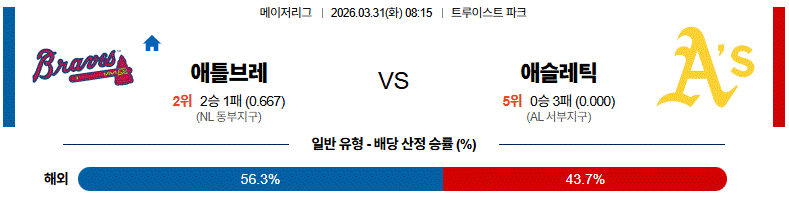 - 애슬레틱스가 초반에는 버틸 수 있겠지만, 애틀랜타가 중후반 득점권 집중력으로 흐름을 잡을 가능성이 높다.