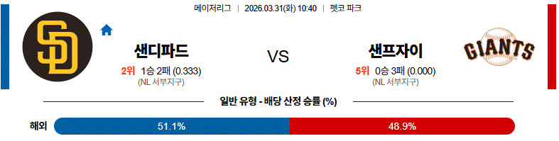 - 승패는 샌디에이고 쪽이지만 접전 가능성이 높아 0핸디가 더 안정적이다.