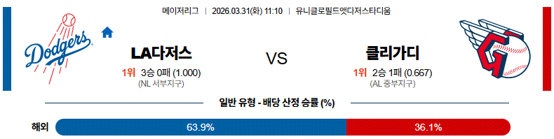 - 클리블랜드도 따라붙는 구간은 만들 수 있겠지만, 장타와 연속 출루가 겹치는 구간에서는 다저스 우세가 선명하다.