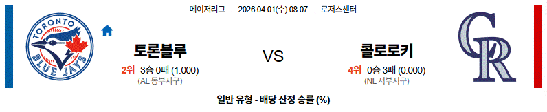 - 토론토: 시즌 초반 3승 0패로 출발하며 타선 응집력과 실점 억제가 안정적이다.