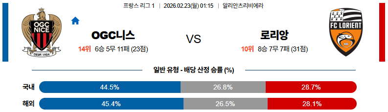 로리앙은 빠른 역습으로 반격을 시도하겠지만 전체적인 경기 흐름은 니스가 주도할 전망입니다.
