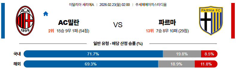 파르마는 수비적으로 라인을 내리며 역습 한 방을 노리겠지만, 밀란의 박스 근처 압박 강도를 버텨내는 것이 핵심입니다.
