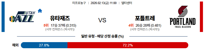 유타 재즈는 직전 마이애미 원정에서 승리하며 분위기 반전에 성공했으나, 워커 케슬러의 시즌 아웃급 부상과 주전 가드 키욘테 조지의 발목 부상으로 전력 누수가 심각합니다. 최근 트레이드 마감 시한을 앞두고 자렌 잭슨 주니어(JJJ)를 영입하는 블록버스터급 행보를 보였으나, 팀 순위상(서부 13위) 적극적인 승리 의지보다는 선수 시험에 비중을 두는 모습입니다. 반면 포틀랜드는 올스타급 활약을 펼치는 대니 아브디야와 골밑의 괴물 신인 도노반 클링언을 앞세워 필라델피아를 대파하는 등 최근 3연승의 가파른 상승세를 타고 있습니다. 유타의 고산 지대 원정이 변수지만, 현재 팀 에너지 레벨과 전력 완성도 면에서 포틀랜드가 우위에 있습니다.