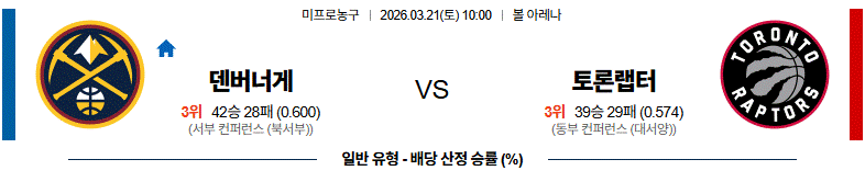 덴버는 직전 경기 패배에도 불구하고 홈에서는 꾸준한 경기력과 함께 요키치를 중심으로 한 공격 전개가 안정적으로 유지되고 있고 상대전에서도 연승 흐름을 이어가며 자신감을 확보하고 있다. 특히, 홈에서는 리바운드와 인사이드 장악 능력에서 우위를 보이며 경기 주도권을 가져오는 패턴이 반복되고 있다. 반면, 토론토는 3연승 흐름 속에서 상승세를 이어가고 있지만 원정에서는 기복이 존재하고 있으며 덴버를 상대로는 최근 맞대결 열세가 이어지고 있다. 또한, 외곽 의존도가 높은 공격 구조가 덴버 수비에 막힐 가능성도 존재한다. 덴버 승리가 예상된다.