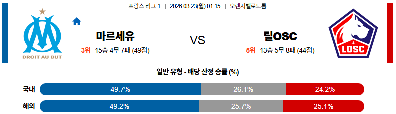 경기 흐름은 마르세유가 공격적으로 밀어붙이는 양상 속에서 릴이 효율적인 대응을 시도하는 구조가 예상됩니다.