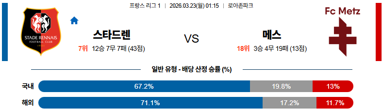 이번 경기는 스타드렌의 공격적인 운영과 메스의 수비 중심 전술이 맞붙는 형태로 전개될 가능성이 높습니다. 스타드렌은 홈에서 빠른 템포로 공격을 이어가며 주도권을 가져가려 할 것이고, 메스는 라인을 내리고 실점을 최소화하며 역습을 노릴 것입니다.