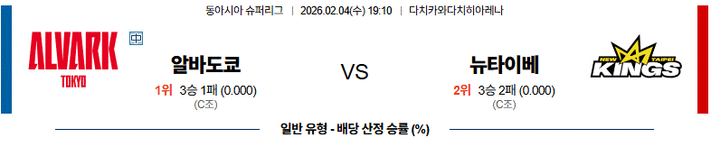 알바크 도쿄는 EASL 일정 원정에서 창원LG 상대로 88-81 승리를 기록했으며 EASL 일정 홈에서 창원LG 상대로 92-73 승리를 기록했다. 올시즌 24승11패 4위를 기록중인 가운데 일본 내에서도 가장 팬층이 두텁고 재정이 안정된 전력을 자랑한다. EASL에서 3연승 흐름 속에 3승1패를 기록 중이며, 외국인 빅맨 세바스찬 사이즈(205cm,C)가 경기당 26.3득점으로 공격의 중심에 있고 라이언 로시터(PF)는 리바운드와 어시스트 모두에서 팀 밸런스를 책임진다. 또한, 마커스 포스터(SG)는 최근 득점 감각이 올라오며 외곽 옵션을 강화했고 오쿠라 소타(PG)와 오사카베 다이키(SF)는 수비와 경기 운영에서 안정감을 더하는 전력 이다. 시즌 첫 맞대결에서 뉴타이베이를 107-89로 제압한 경험이 있고 홈인 다치카와에서 파이널 직행을 노린다.