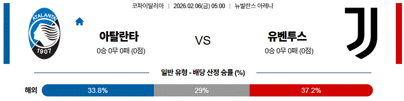 아탈란타가 홈에서 주도권을 잡겠지만, 유벤투스의 수비 조직과 실리 운영이 쉽게 무너지지 않을 경기입니다.