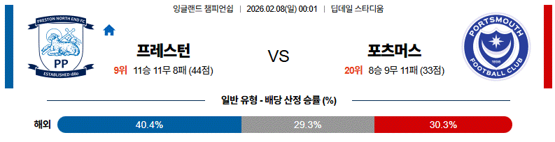 체력적인 측면에서도 포츠머스는 주중 일정이 겹친 상황이라 후반으로 갈수록 압박 대비와 라인 유지가 붕괴될 여지가 크고, 그때마다 프레스턴의 전방 압박 강도는 오히려 더 위협적으로 체감될 수 있다.