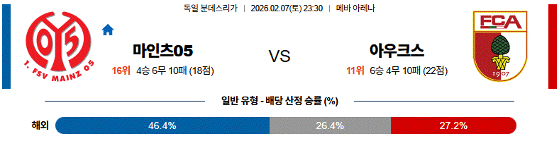 열람 축구 2월 07일 분데스리 마인츠05 vs 아우크스 해외축구분석 1 14 02-05