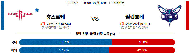 휴스턴은 직전 보스턴전 완패로 흐름이 끊겼지만 홈에서는 17승5패로 안정적인 경기력을 유지하고 있다. 알페렌 센군을 중심으로 한 인사이드 전개와 수비 압박은 홈에서 강점으로 작용하고, 케빈 듀란트도 경기 감각을 끌어올릴 여지가 있다. 연속경기 일정이지만 우도카 감독 체제에서 홈 집중력은 여전히 신뢰 요소다. 반면, 샬럿은 7연승 상승세와 함께 원정 성적도 나쁘지 않지만 최근 승리 과정에서 후반 의존도가 높았고 트레이드 직후 로테이션 안정성은 변수다.