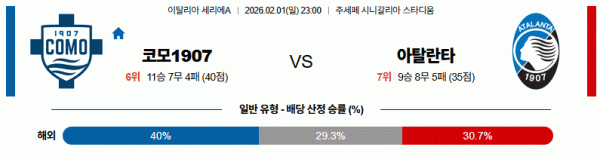 코모는 수비적으로 내려서며 실점을 최소화하려 하겠지만, 아탈란타의 강한 압박과 공격 전개를 버텨내기에는 쉽지 않아 보입니다.