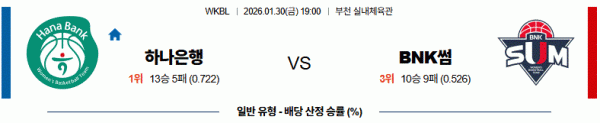 하나은행은 연속경기 일정이였던 직전경기(1/25) 홈에서 KB스타즈 상대로 75-87 패배를 기록했으며 이전경기(1/24) 홈에서 삼성생명 상대로 60-62 패배를 기록했다. 6연승이 중단되는 패배가 나온 이후 2연패에 빠졌으며 리바운드(28-47), 3점슛(6-8), 범실(7-6)의 결과. 진안(27득점)은 골밑과 미드레인지에서 적극적인 공격으로 팀 득점을 책임졌고, 이이지마 사키(20득점)도 외곽과 돌파로 분전했지만 리바운드에서 크게 밀리며 공격 기회가 제한됐고, 수비에서도 KB의 높이와 활동량을 막아내지 못했던 경기. 2쿼터 이후 점수 차가 점차 벌어졌고, 수비에서 지나치게 소극적이었으며, 상대의 압박에 맞서려는 의지가 보이지 않았던 상황. 또한, 연이은 일정 속에서 체력적인 부담이 컸던 선수들의 모습도 확인할수 있었다. 정규시즌 홈경기에서는 2연패 흐름속에 6승3패 성적.