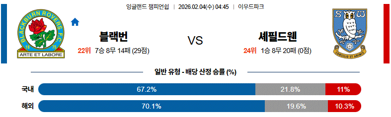 셰필드 웬즈데이가 수비로 버티겠지만, 홈 이점과 공격 주도권을 가진 블랙번이 우세한 경기입니다.
