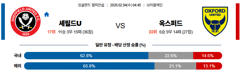 옥스퍼드가 수비적으로 버티겠지만, 전력과 홈 이점을 고려하면 셰필드 U가 우세한 경기입니다.