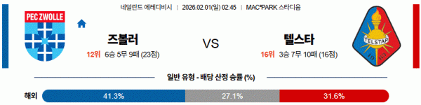 전체적으로 즈볼러 우세 속에 저득점 경기 흐름이 예상됩니다.