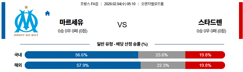 스타드 렌의 역습 위협은 변수지만, 홈에서의 압박과 경기 운영 면에서는 마르세유가 앞서는 경기입니다.