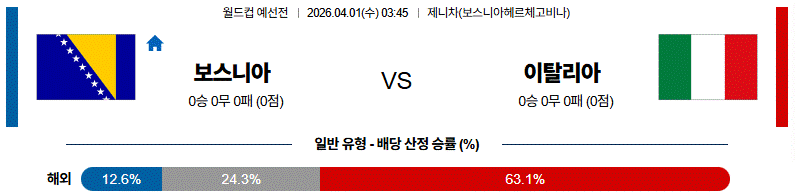이탈리아가 수비 라인을 유지하며 안정적으로 경기를 풀어갈 경우 경기 주도권을 가져갈 수 있으며, 보스니아는 세트피스에서의 효율이 승부를 좌우할 수 있습니다.