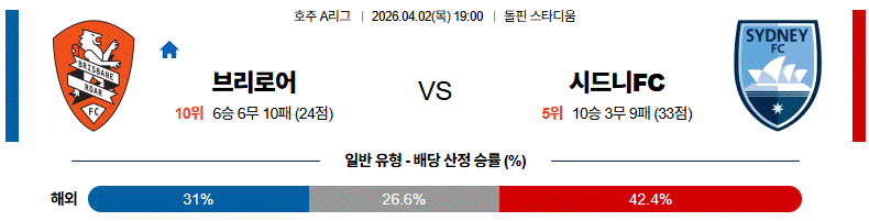 결국 이 경기는 브리즈번 로어가 높은 라인을 유지하는 순간부터 위험이 시작되고, 시드니FC는 그 뒤를 찌르는 가장 확실한 해법을 갖고 들어가는 승부다.