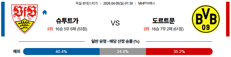 슈투트가 vs 도르트문 경기 분석은 공격 성향이 강한 두 팀이 맞붙는 난타전 양상의 매치업입니다.