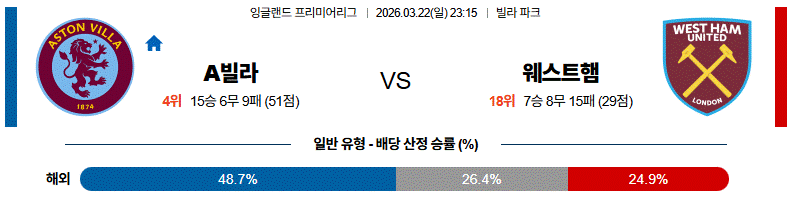 경기 양상은 A빌라가 주도권을 잡고 공격적으로 나서며, 웨스트햄이 제한적인 찬스를 노리는 구조로 전개될 가능성이 큽니다.