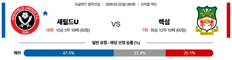 ⚠️ 중원 연결 속도와 전방 침투의 질, 그리고 렉섬의 느린 다음 선택까지 모두 감안하면 이 경기는 셰필드 유나이티드가 주도권을 잡고 승부를 가져갈 가능성이 높다.
