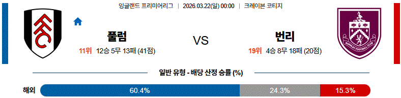 이번 경기는 풀럼이 홈에서 주도권을 잡을 가능성이 높은 매치업입니다.