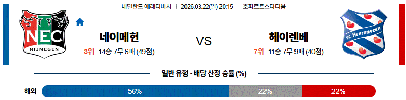 맞대결에서도 비교적 접전 양상이 많으며, 득점 교환이 자주 발생하는 특징이 있습니다. 경기 흐름은 네이메헌이 홈에서 공격적으로 나서고, 헤이렌베 역시 맞불을 놓으며 공방전 양상으로 전개될 가능성이 높습니다.