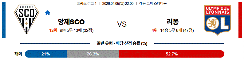 전체적으로는 리옹 우세 흐름 속에서 앙제의 역습 변수까지 고려하면 다득점 양상도 충분히 기대할 수 있는 매치업입니다.