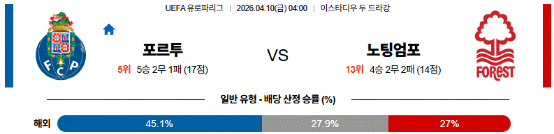 이번 UEL 경기는 홈에서 강한 경기력을 보이는 포르투와 역습 중심의 노팅엄포가 맞붙는 경기입니다.