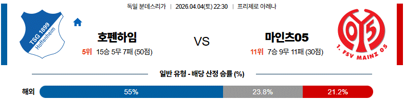 ⚠️ 결국 전환의 속도와 수비 재정비 타이밍에서 앞선 호펜하임이, 마인츠의 느슨한 리커버리 구조를 파고들며 승부를 가져갈 가능성이 높다.