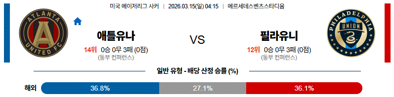 열람 축구 3월 15일 메이저리그사커 애틀랜타 유나이티드 FC vs 필라델피아 유니언 해외축구분석 5 03-13