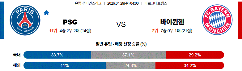 열람 축구 4월 29일 UCL PSG vs 바이뮌헨 해외축구분석 2 04-27