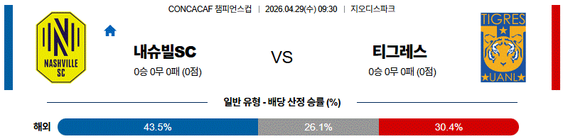 열람 축구 4월 29일 C챔피언 내슈빌SC vs 티그레스 해외축구분석 2 04-27