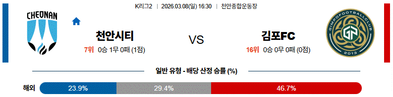 전체적으로는 수비 조직력과 경기 운영 안정성이 뛰어난 김포FC가 조금 더 유리한 흐름을 가져갈 가능성이 있습니다.