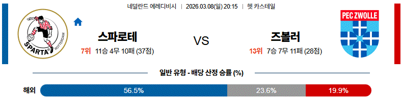 전체적으로는 홈 이점과 경기 운영 안정성을 갖춘 스파르타 로테르담이 조금 더 유리한 흐름을 가져갈 가능성이 있습니다.