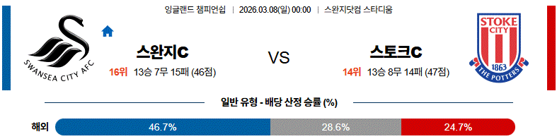 3월 08일 잉글랜드 챔피언쉽 스완지 시티 vs 스토크 시티 해외축구분석