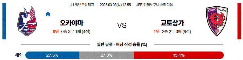 전술적 상성과 중원에서의 우위, 그리고 전진 패스 이후 박스 앞에서의 완성도까지 종합하면, 이번 경기는 교토퍼플상가 우세와 함께 오카야마 패 흐름 쪽으로 해석하는 것이 보다 합리적인 선택에 가깝다.