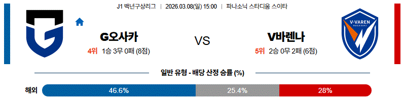 이런 전술적 상성과 최근 구조적인 흐름을 종합하면, 메시노와 제발리를 앞세운 감바 오사카가 경기 주도권을 잡고 승점 3점을 가져갈 가능성에 좀 더 무게를 두는 선택이 합리적으로 보인다.
