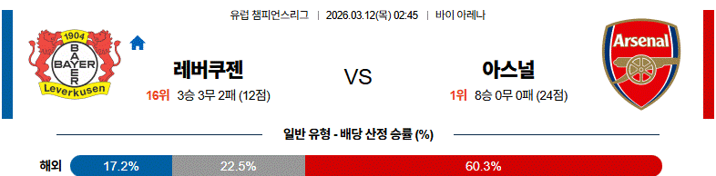 경기 양상은 아스널이 점유율을 가져가고 레버쿠젠이 빠른 공격 전환으로 대응하는 형태가 예상됩니다.