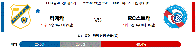 경기 양상은 리예카가 활동량과 압박을 통해 공격적으로 나서고 RC스트라는 조직적인 패스 플레이로 대응하는 흐름이 예상됩니다.