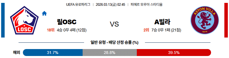 전체적으로는 릴의 홈 압박과 아스톤 빌라의 안정적인 전술 운영이 맞붙는 팽팽한 경기 흐름이 예상됩니다.