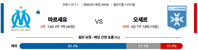 경기 양상은 마르세유가 점유율과 공격 전개를 통해 주도권을 잡고 오세르가 수비 이후 역습으로 대응하는 흐름이 예상됩니다.