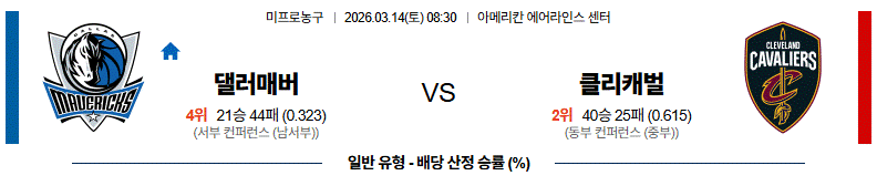 댈러스는 멤피스 원정 이후 이어지는 백투백 일정의 체력적 부담을 안고 있으며, 클리블랜드는 직전 올랜도전 패배를 만회하기 위해 하든과 미첼을 앞세운 강력한 화력으로 승차 조절에 나설 것으로 보입니다.