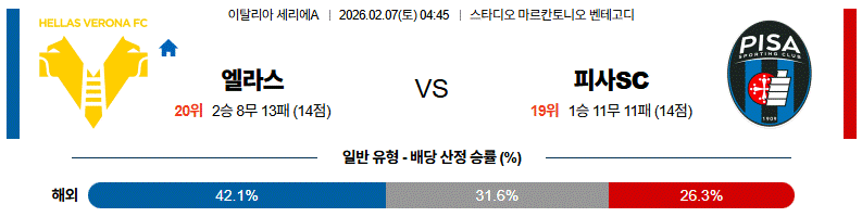 홈 이점과 수비 안정성에서 엘라스 베로나가 앞서는 경기입니다.