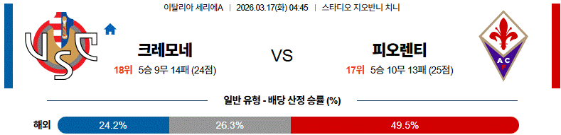 크레모네와 피오렌티나는 리그 하위권에서 치열한 승점 경쟁을 펼치고 있는 상황으로 두 팀 모두 승점 확보가 중요한 경기입니다.