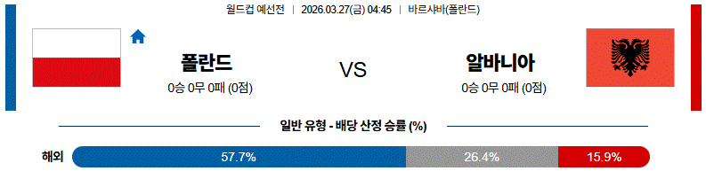 다만 알바니아의 수비 조직력이 견고한 만큼 다득점보다는 제한적인 득점 흐름이 이어질 가능성이 크며, 폴란드의 효율적인 마무리가 중요 변수로 작용할 것입니다.